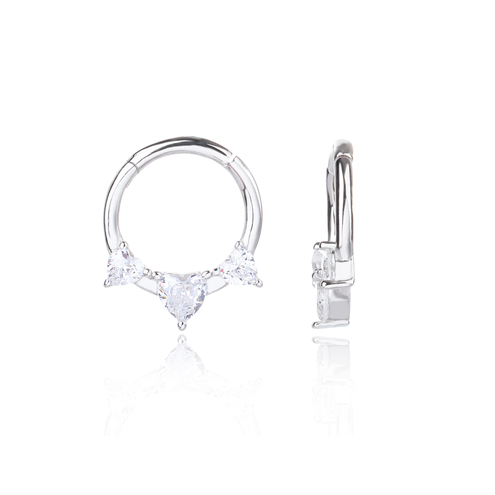 עגילי כסף אלגנטיים בעיצוב עגול עם שלושה אבני זירקוניה בצורת טיפה ולב, המעניקים מראה עדין וזוהר. מתאימים לכל אירוע ומוסיפים נגיעה של יוקרה.