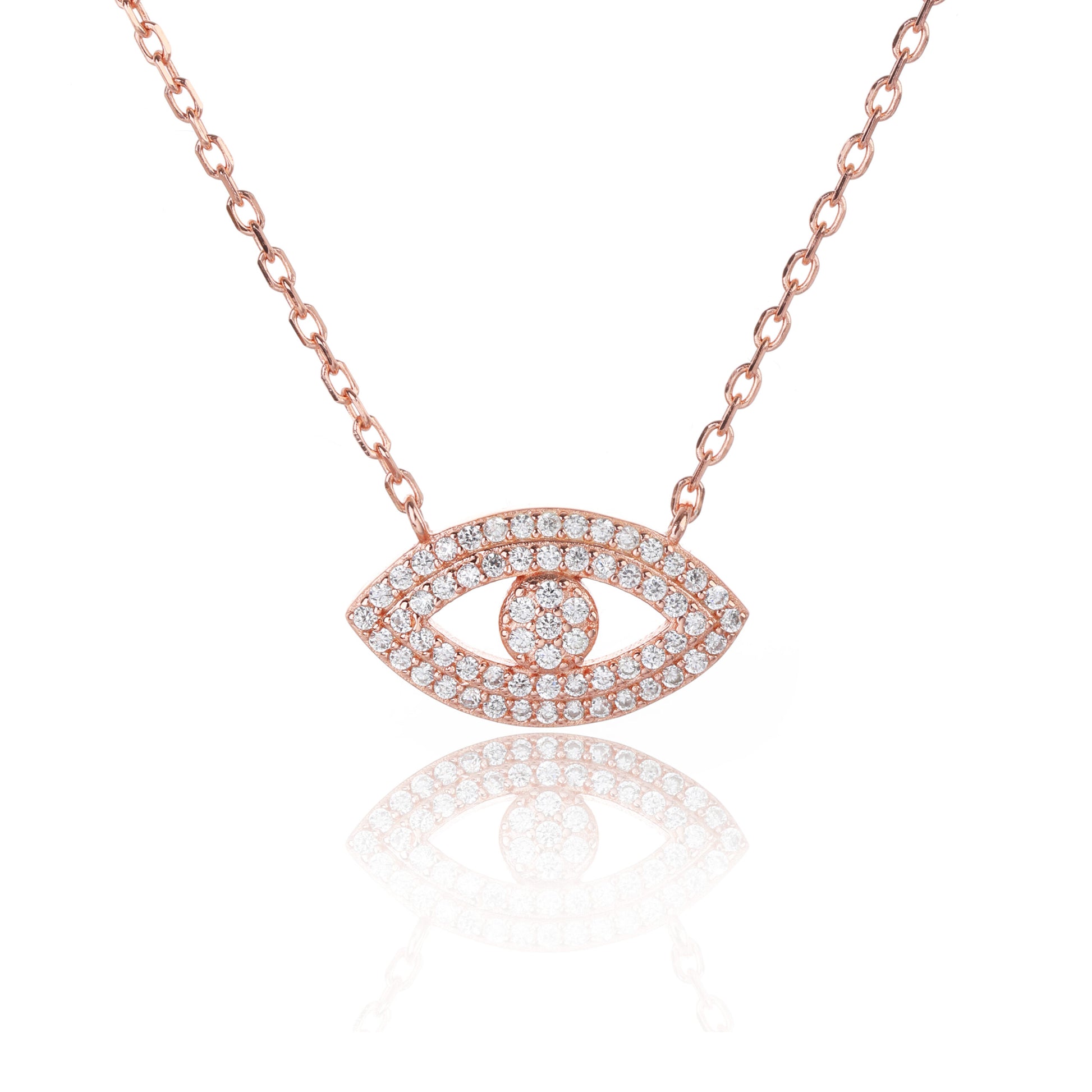 שרשרת עוצמתית ומלאת נוכחות בעיצוב עין המזל, מצופה זהב ורוד ומשובצת אבני זירקוניה נוצצות. סמל להגנה ואנרגיה חיובית עם נגיעה של יוקרה וסטייל. 👁✨